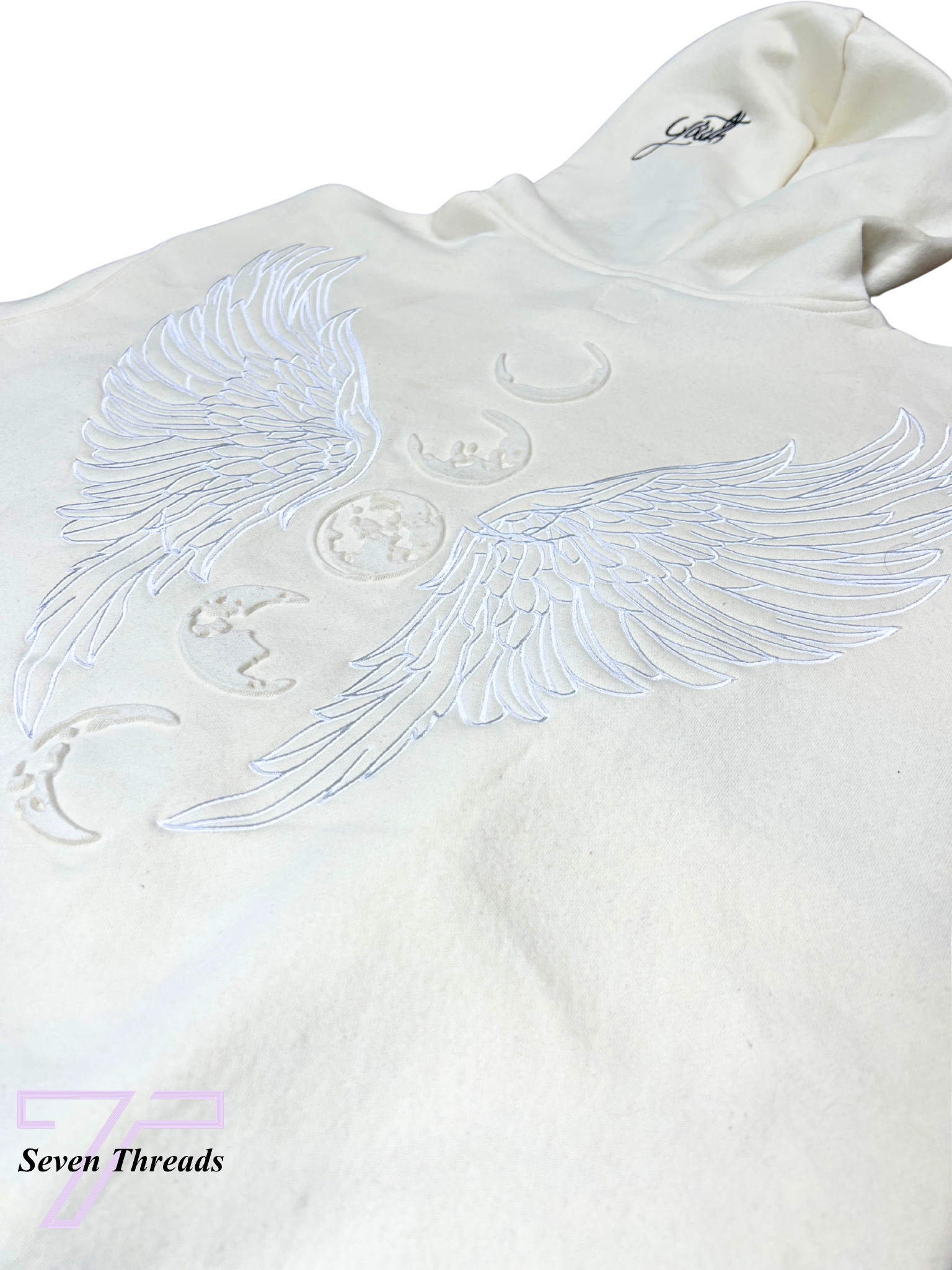 Embossed moon phases and embroidered angel wings spanning the back — the showstopping centerpiece of this piece